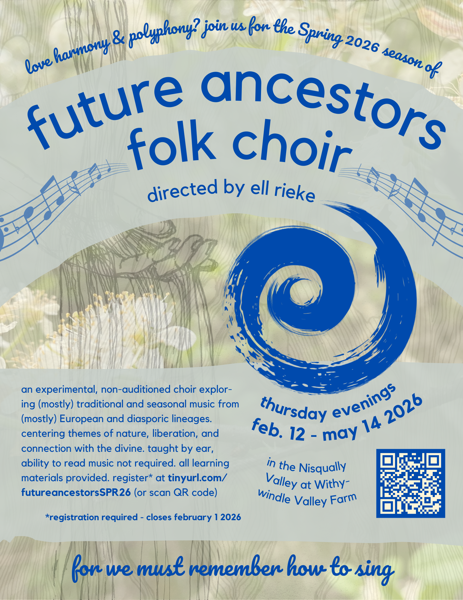 For the upcoming Spring season we will learn songs with themes relating to spring and early summer. This may include working songs, songs of spring and summer holidays, and songs with themes like emergence, growth, moving water, courtship, sexuality, and worshipping the sun. Rehearsals will be Thursdays evenings in an open-air barn in the Nisqually Valley off exit 114.